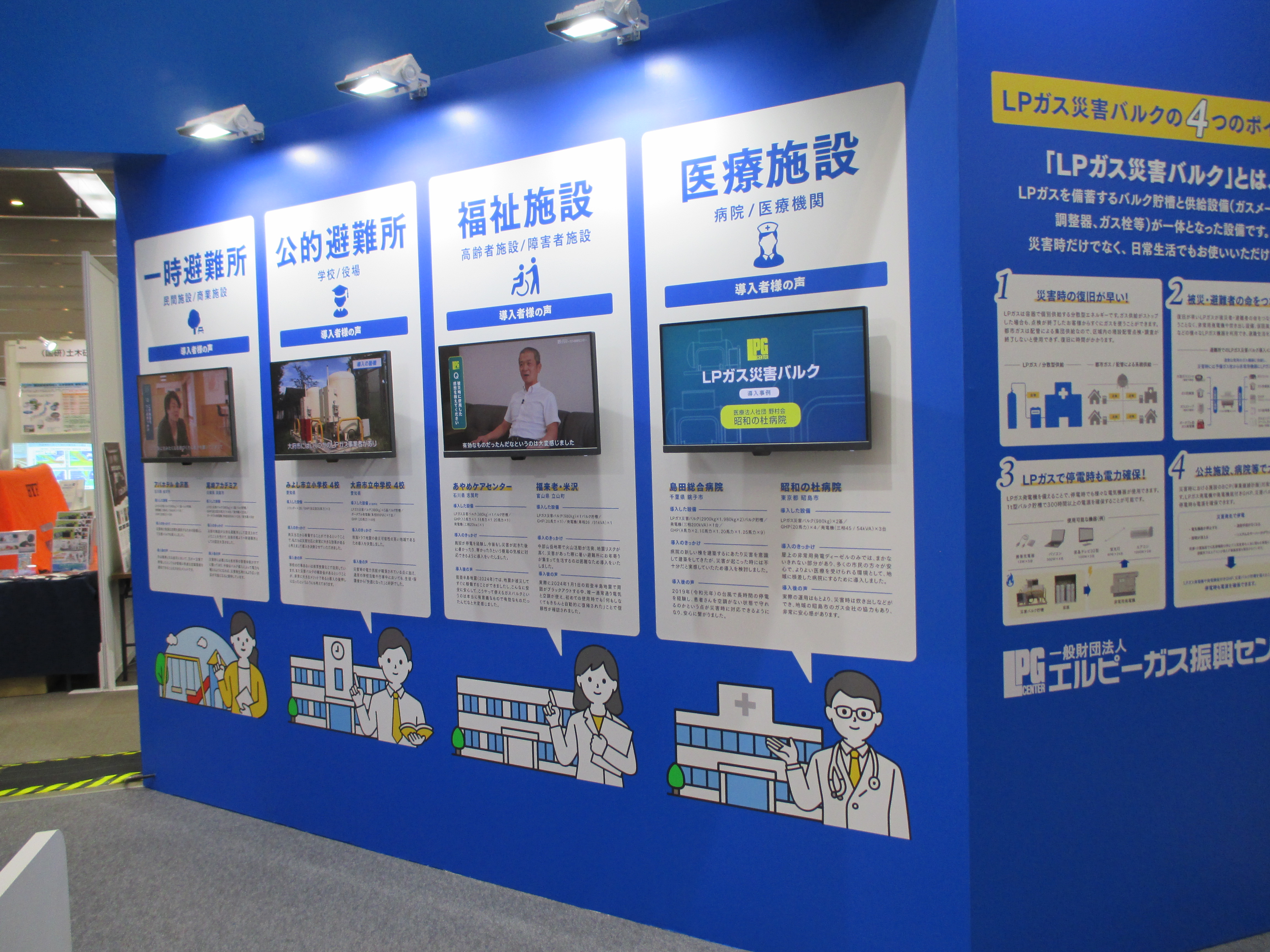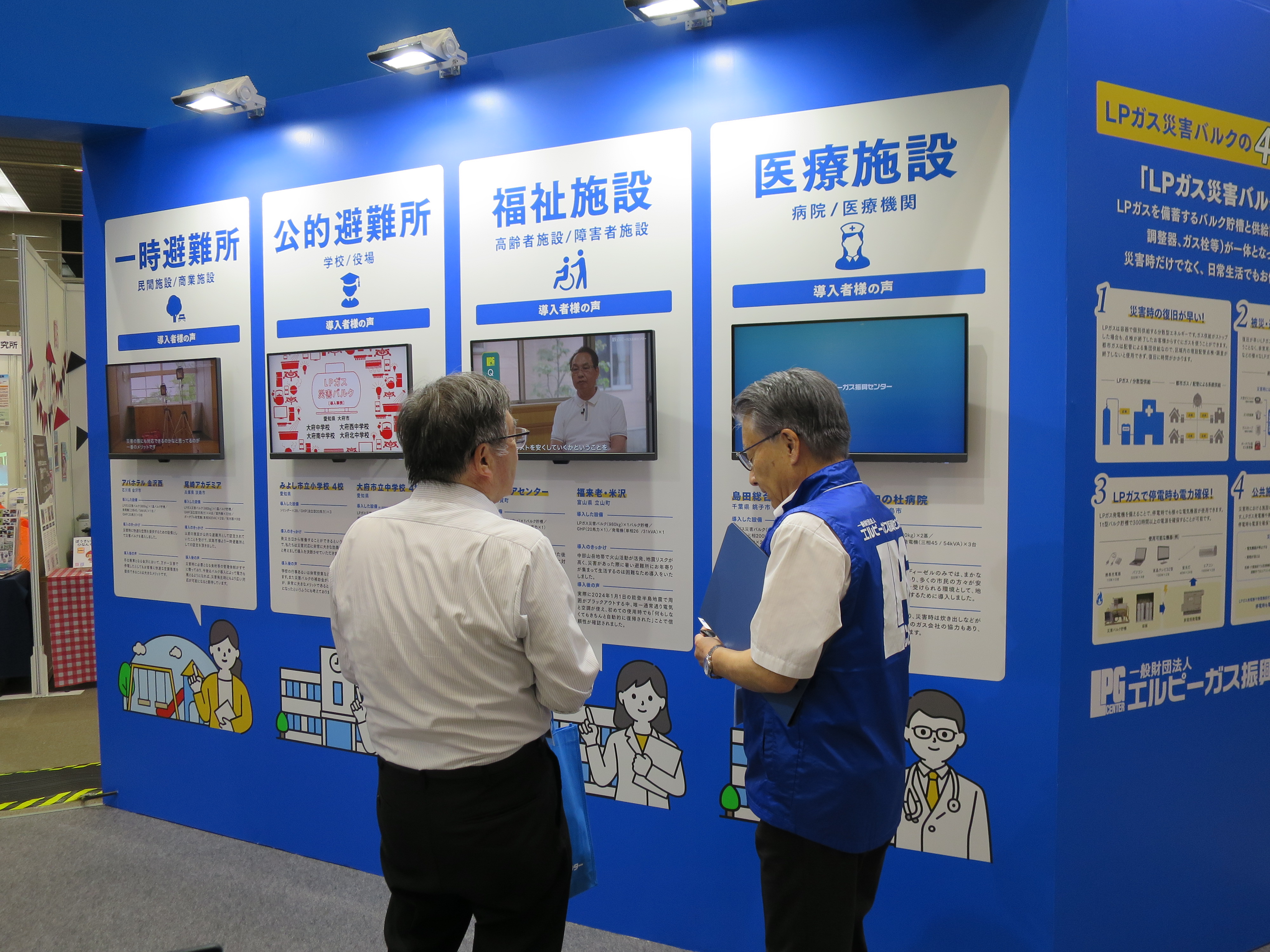 「医療施設」「福祉施設」「公的避難所」「一時避難所」といった施設別設置事例を動画で紹介するコーナーや、能登半島地震被災地での設置事例や稼働状況を撮影した特集動画の配信を行うコーナーでは来場者が次々と興味深そうにモニターを眺めていました。特に2023年12月にLPガス設備を設置した数日後に能登半島地震で被災した施設の事例では、被災直後に設備が稼働したことで電気や空調がすぐに復旧し「施設の利用者様や受け入れた避難者の方々に寒い思いをさせることなくお過ごしいただけた」といった声をご紹介すると説明をお聞きになった来場者は深い関心を寄せていました。