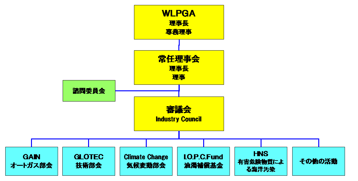 | 4.国際的な位置づけ (1)国際連合(UN)の社会・経済評議会のLPガスに関する諮問機関として承認されてい ます。 (2)国際海事機構(IMO)および国際ガス連盟(IGU)と密接な協力関係を有すると共 に、国際化標準機構(ISO)にLPガスおよび関連機器・装置の規格について、助言 ・提案する機関となっています。 (3)世界銀行による発展途上国へのLPガス関連の援助について、助言する機関になってい ます。 (4)HNS(有害危険物質による海洋汚染)問題を扱うIOPCF(国際油濁補償基金、本 部:英国・ロンドン)における世界のLPガス業界を代表する国際機関として、オブザ ーバーとなっています。 HNS:Hazardous and Noxious Substances IOPCF:The International Oil Pollution Compensation Funds 5.日本の会員と位置づけ等 (1)日本の会員数は15企業・団体であり(2014年9月現在)、会員数では米国に次ぐ 主要メンバー国です。日本の団体会員としては、日本LPガス協会、高圧ガス保安協 会、エルピーガス振興センターなどがあり、また、企業も12社が会員となっていま す。 (2)エルピーガス振興センター・理事長は、WLPGAにおいて世界を代表する理事の一人 として任命されています(マイアミ大会で理事は11名になりました)。今回のマイア ミ大会においては、エルピーガス振興センターの松澤理事長(ENEOSグローブ・社 長)がWLPGA理事に就任いたしました。 (3)WLPGAの方向性などの需要な事項を検討する審議会(Industry Council)のメンバ ーとして日本も参加しています。 (4)WLPGAのHNS関連活動において、日本は継続的にサポートしています。 Ⅲ WLPGAの組織と活動 1.組織・総会・理事会等 (1)総会は年1回開催されます。今年はマイアミで開催されました。ちなみに、昨年は英国 ・ロンドンで開催され、英国王室のアン王女がご挨拶されるなど、格調の高い会議です。 また、理事会(Board of Director Meeting)は年3回程度開催され、その内1回は総会 に合せて開催しています。 (2)審議会(Industry Council)は、WLPGAの戦略の方向付けを審議する重要な会議で す。 (3)活動テーマとして「オートガス部会」「技術部会」「気候変動部会」のほか、油濁補償 基金、有害危険物質(HNS)による海洋汚濁……などLPガスに関係の深いテーマを扱 っています。 |