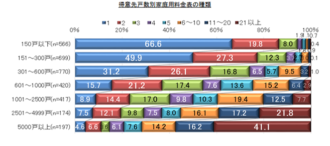 | 得意先戸数が多い事業者ほど料金表の種類が増していくことが読み取れます。 但し、得意先5,000戸以上の販売事業者でも、料金表が一種類の事業者が4.6%存在し その事業者の経営方針によるものと思われます。 |