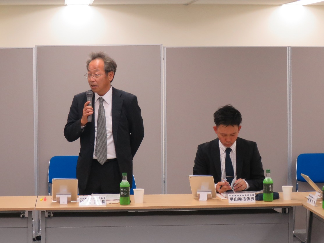 | 開会挨拶する中部経済産業局資源エネルギー環境部 松宮課長、 右は中部地方の行政連携状況を説明した同部資源・燃料課 平山総括係長 |