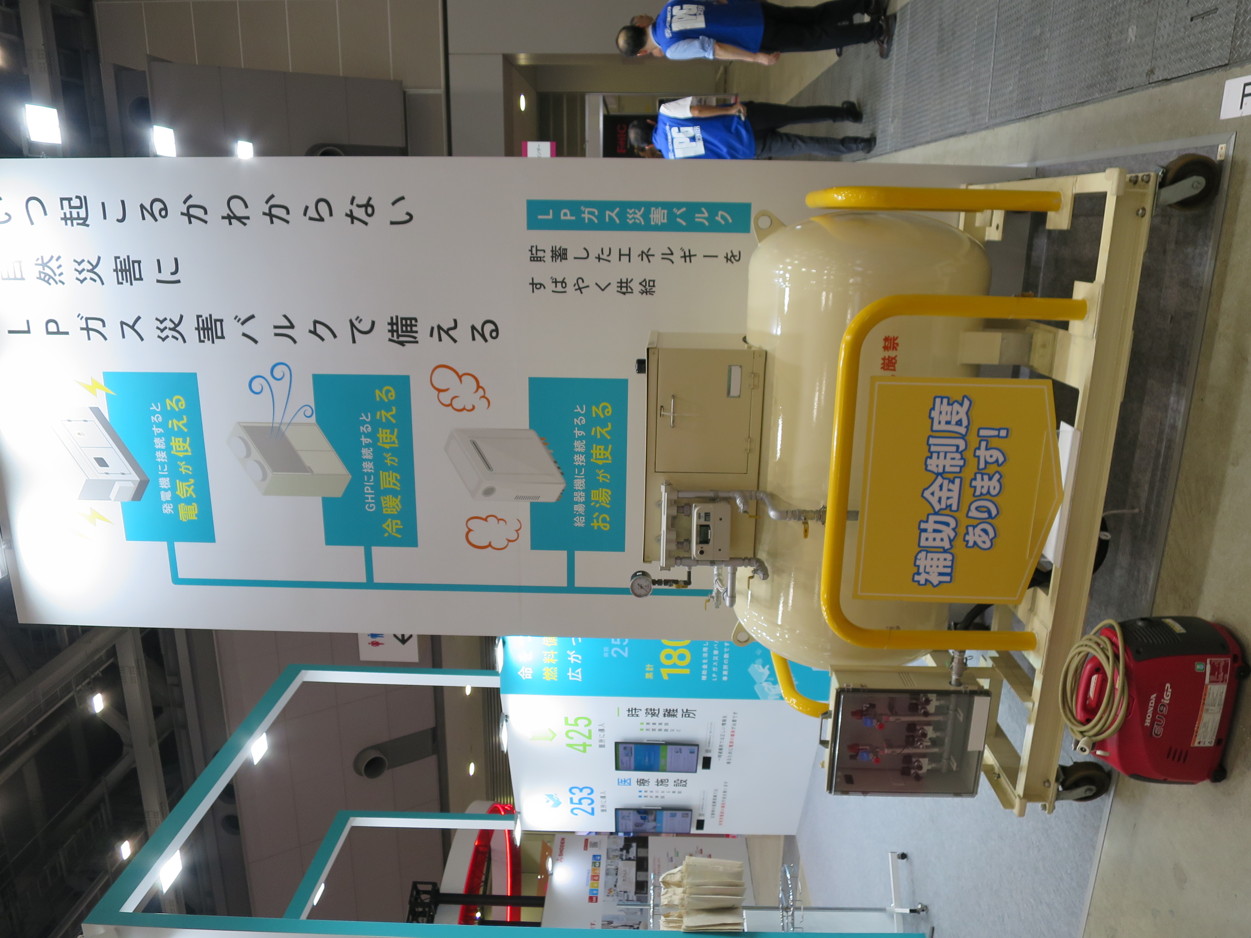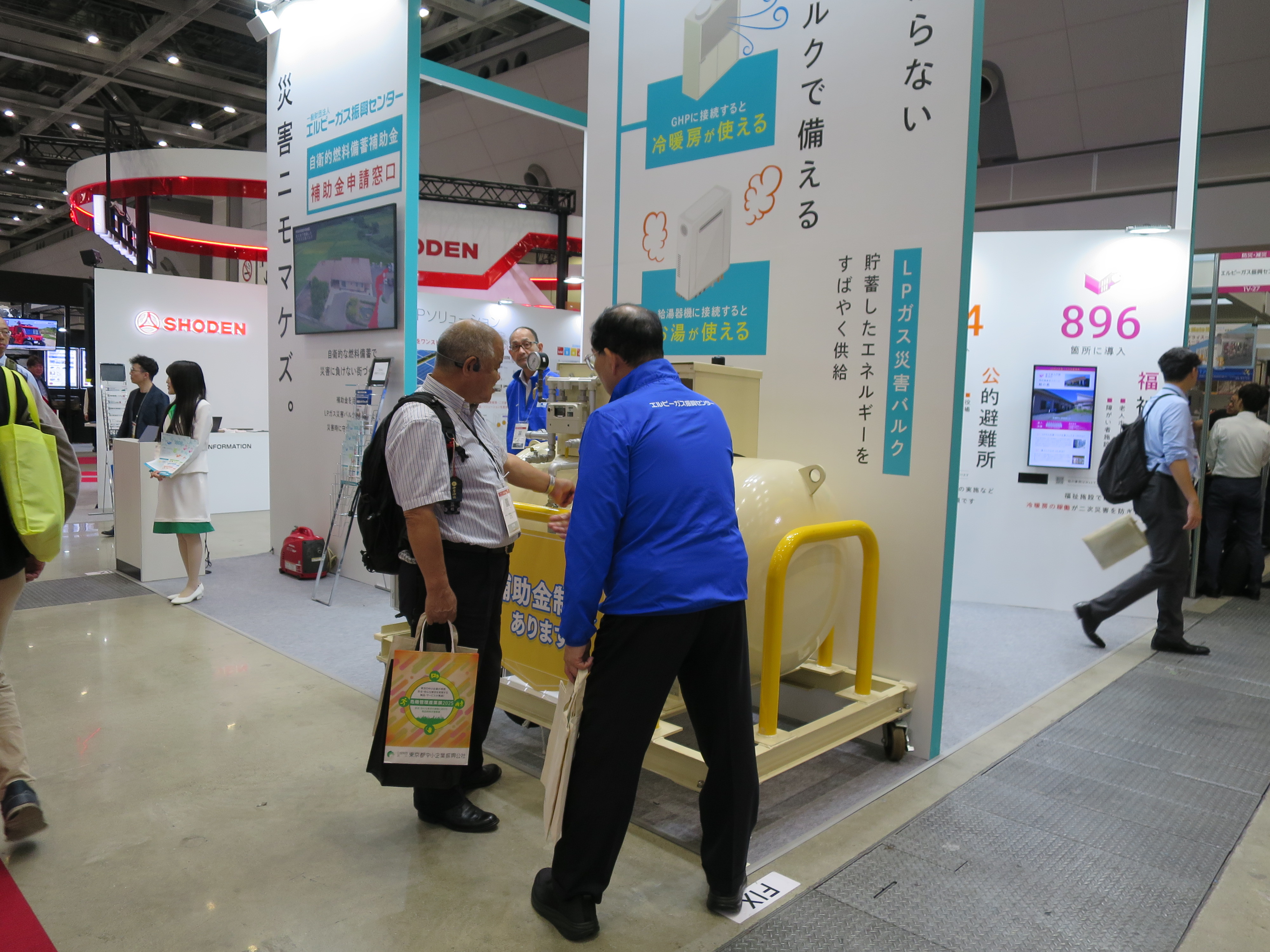 | ブース正面に展示したLPガスバルク貯槽(300kg)と接続可能な設備機器のパネルを前に、具体的な質問をされる方も多く、来場者の関心の高さがうかがえました。 |